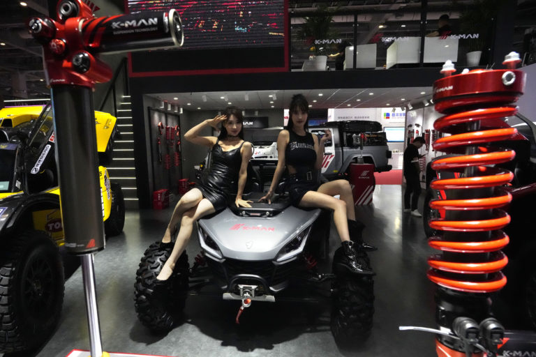 Modelky pózujú s terénnou buginou počas autosalónu Auto Shanghai 2023 v Šanghaji, v stredu 19. apríla 2023. Foto: SITA/AP, Ng Han Guan