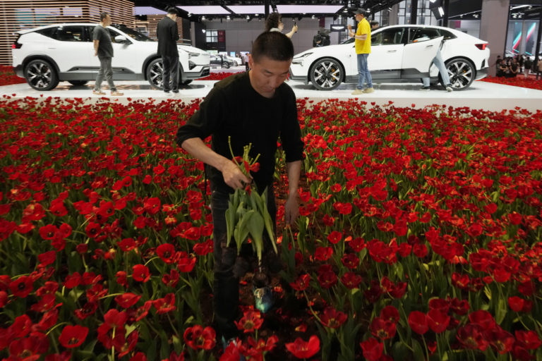 Pracovník vymieňa kvety v stánku pre značku elektrických výkonných áut Polestar počas výstavy Auto Shanghai 2023 v Šanghaji, v stredu 19. apríla 2023. Foto: SITA/AP, Ng Han Guan