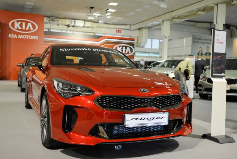 Pohľad na automobil Kia Stinger počas Autosalónu Autoshow Nitra 2017 - 24. ročníka prehliadky osobných, úžitkových a nákladných automobilov, dopravnej techniky, autopríslušenstva a servisnej i garážovej techniky. Nitra, 5. október 2017. Foto: SITA/Martin Medňanský