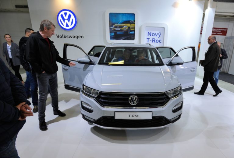 Návštevníci si prezerajú Volkswagen T-Roc počas Autosalónu Autoshow Nitra 2017 - 24. ročníka prehliadky osobných, úžitkových a nákladných automobilov, dopravnej techniky, autopríslušenstva a servisnej i garážovej techniky. Nitra, 5. október 2017. Foto: SITA/Martin Medňanský