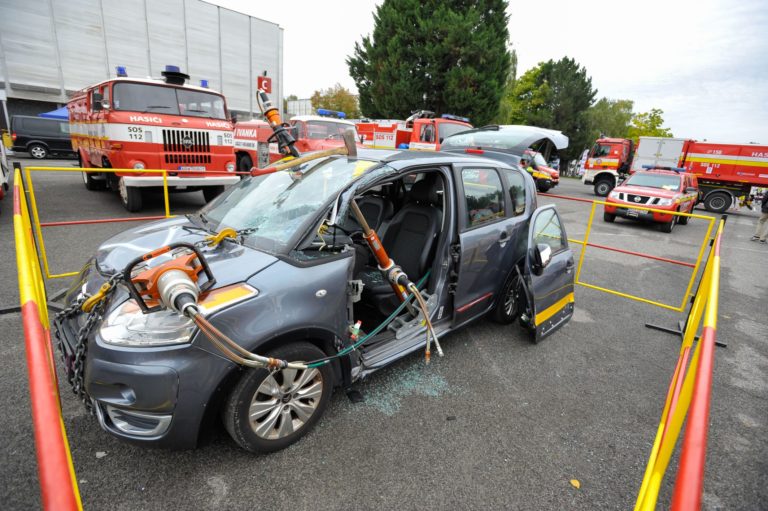 Pohľad na ukážku zásahu vyprosťovacou technikou Hasičského a záchranného zboru (HaZZ) počas Autosalónu Autoshow Nitra 2017 - 24. ročníka prehliadky osobných, úžitkových a nákladných automobilov, dopravnej techniky, autopríslušenstva a servisnej i garážovej techniky. Nitra, 5. október 2017. Foto: SITA/Martin Medňanský