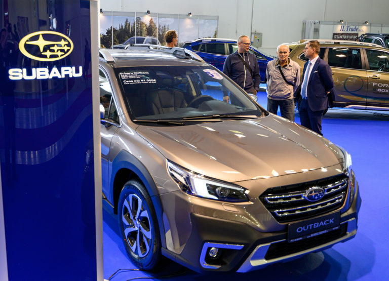 Návštevníci si prezerajú vozidlo Subaru Outback počas otvorenia výstavy Autosalón Autoshow Nitra 2022 výstavisku Agrokomplex v Nitre. Nitra, 13. október 2022. Foto: SITA/Martin Havran