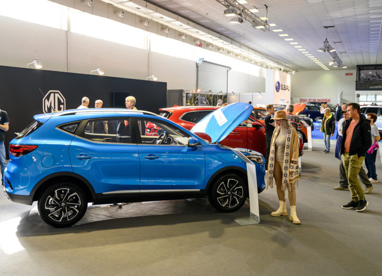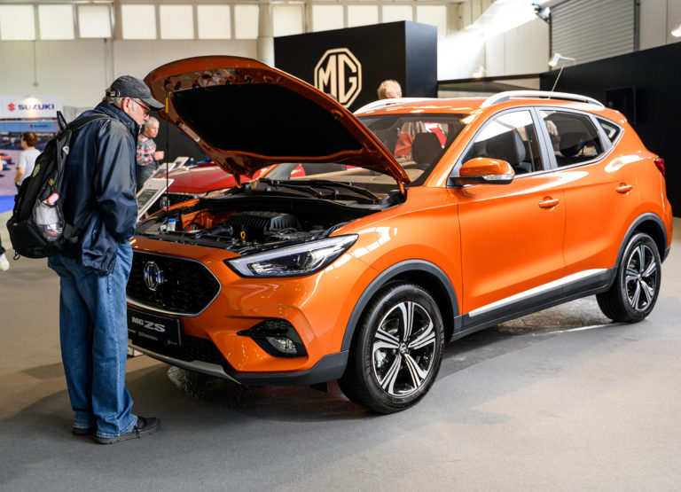 Návštevníci si prezerajú rodinné vozidlo MG ZS počas otvorenia výstavy Autosalón Autoshow Nitra 2022 výstavisku Agrokomplex v Nitre. Nitra, 13. október 2022. Foto: SITA/Martin Havran
