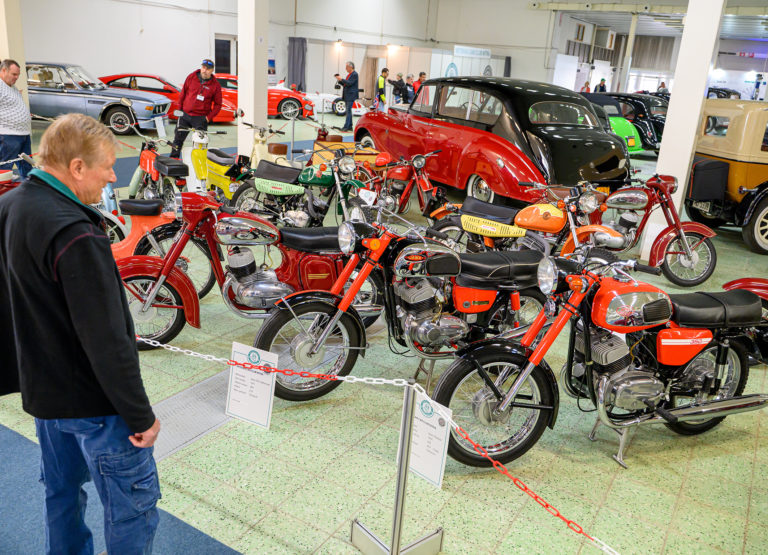Návštevník si prezerá motocykle JAWA počas otvorenia výstavy Autosalón Autoshow Nitra 2022 výstavisku Agrokomplex v Nitre. Nitra, 13. október 2022. Foto: SITA/Martin Havran
