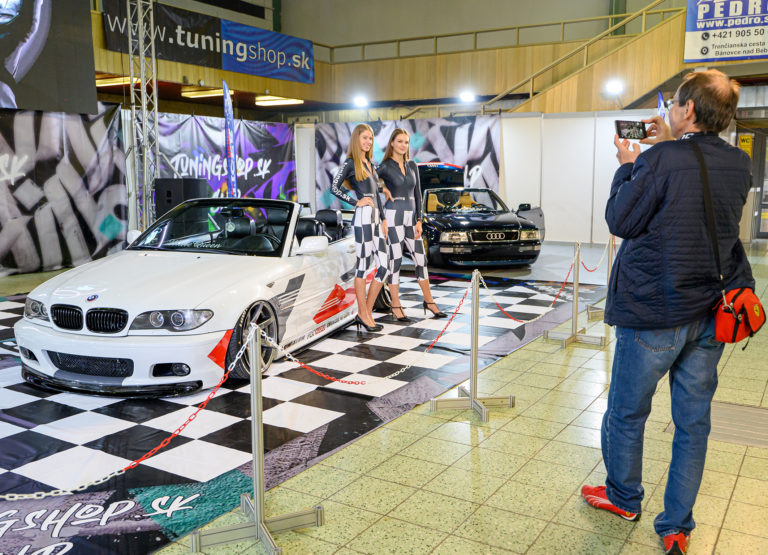 Návštevník si fotí hostestky pri speciálne upravenom vozidle v stánku Tuningshop počas otvorenia výstavy Autosalón Autoshow Nitra 2022 výstavisku Agrokomplex v Nitre. Nitra, 13. október 2022. Foto: SITA/Martin Havran