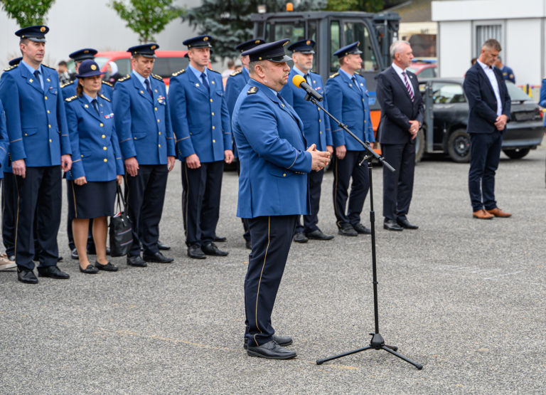 Prezident Hasičského a záchranného zboru (HaZZ) Pavol Mikulášek v príhovore počas slávnostného otvorenia majstrovstiev SR vo vyslobodzovaní zranených osôb z havarovaných vozidiel, ktoré organizovalo Ministerstvo vnútra SR a Prezídium Hasičského a záchranného zboru v priestoroch výstaviska Agrokomplex Nitra. Nitra, 14. október 2022. Foto: SITA/Martin Havran