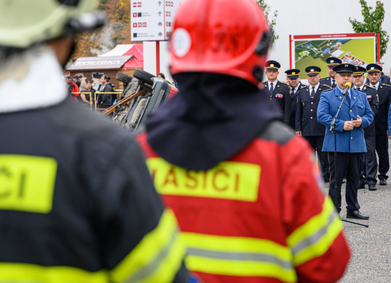 Prezident Hasičského a záchranného zboru (HaZZ) Pavol Mikulášek (v popredí) v príhovore počas slávnostného otvorenia majstrovstiev SR vo vyslobodzovaní zranených osôb z havarovaných vozidiel, ktoré organizovalo Ministerstvo vnútra SR a Prezídium Hasičského a záchranného zboru v priestoroch výstaviska Agrokomplex Nitra. Nitra, 14. október 2022. Foto: SITA/Martin Havran