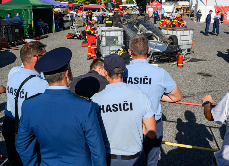 Prezentácia Hasičského a záchranného zboru SR, ktorý na pôde nitrianskeho výstaviska organizuje Majstrovstvá Slovenskej republiky vo vyslobodzovaní zranených osôb z havarovaných vozidiel počas výstavy Autosalón Autoshow Nitra na výstavisku Agrokomplex v Nitre. Nitra, 28. september 2023. Foto: SITA/Martin Havran