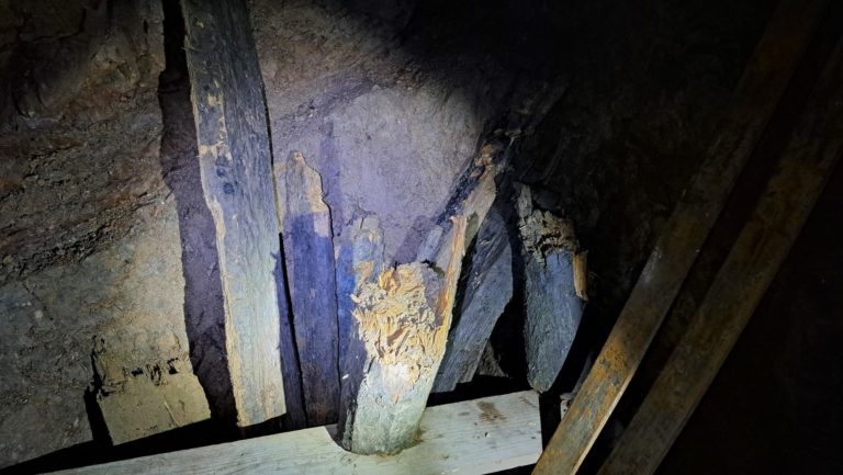 Pôvodné drevené výstuhy z bočnej steny štôlne Strieborná v Poprade-Kvetnici nájdené pri banských prácach. Poprad, 16. november 2023. Foto: SITA/Mária Frisová