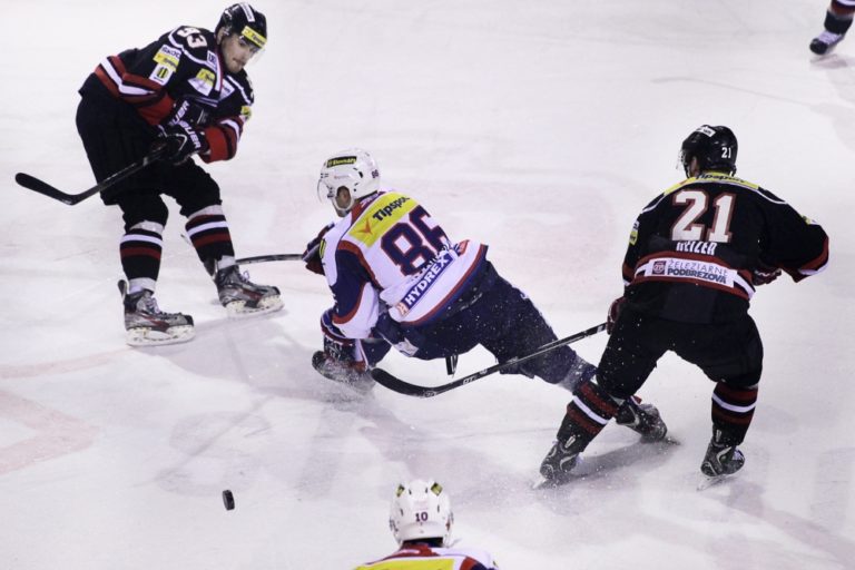 Radomír Heizer (vpravo) z HC'05 Banská Bystrica a Tomáš Škvaridlo (uprostred) z HKM Zvolen počas 48. kola slovenskej hokejovej Tipsport extreligy 2013/2014 medzi HC'05 Banská Bystrica - HKM Zvolen. Banská Bystrica, 11. február 2014. Foto: SITA/Ján Viazanička