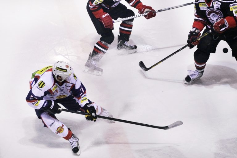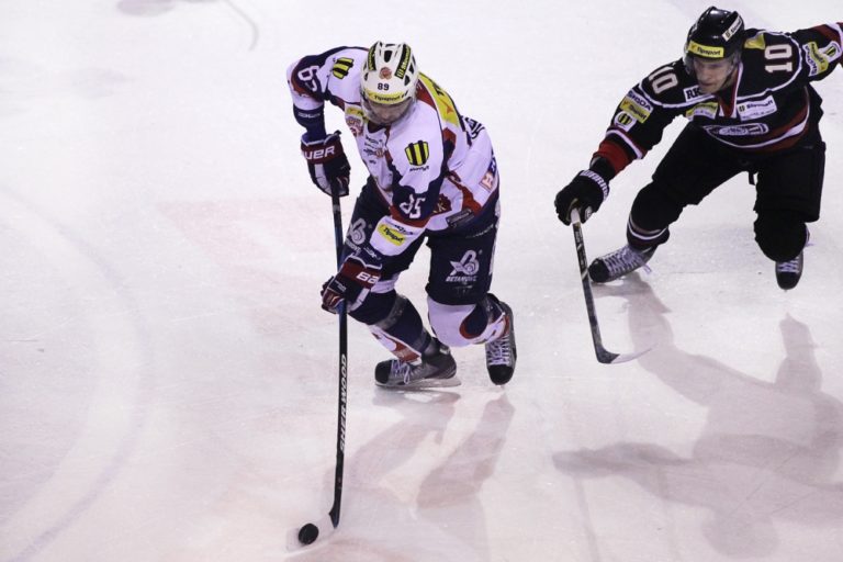 Patrick White (vpravo) z HC'05 Banská Bystrica počas 48. kola slovenskej hokejovej Tipsport extreligy 2013/2014 medzi HC'05 Banská Bystrica - HKM Zvolen. Banská Bystrica, 11. február 2014. Foto: SITA/Ján Viazanička