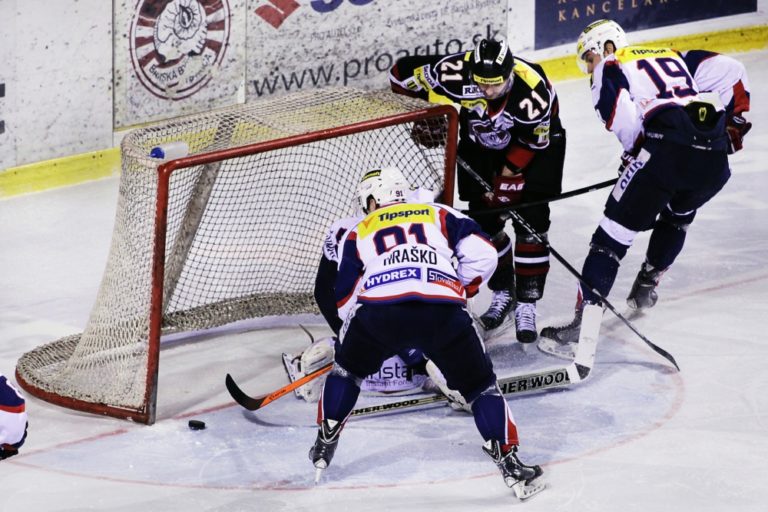Radomír Heizer (druhý sprava) z HC'05 Banská Bystrica Peter Hraško (uprostred) z HKM Zvolen počas 48. kola slovenskej hokejovej Tipsport extreligy 2013/2014 medzi HC'05 Banská Bystrica - HKM Zvolen. Banská Bystrica, 11. február 2014. Foto: SITA/Ján Viazanička