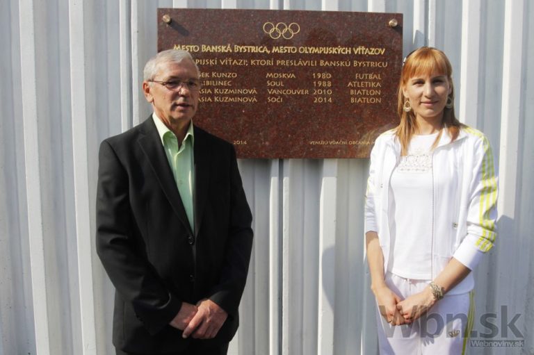 Futbalista František Lunzo a biatlonistka Anastasia Kuzminová počas odhaľovania tabule pre olympijských víťazov. Banská Bystrica, 17. september 2014. Foto: SITA/Miroslava Chabadová