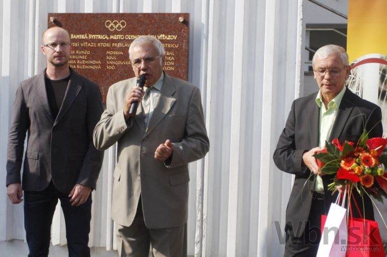 Jozef Ivan (v strede) počas odhaľovania tabule pre olympijských víťazov. Banská Bystrica, 17. september 2014. Foto: SITA/Miroslava Chabadová