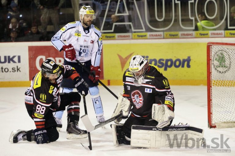Andreas Andersson (vpravo) a Patrick White (vľavo) z HC´05 Banská Bystrica a René Školiak (v strede) z HK Nitra počas šiesteho semifinálového zápasu play-off slovenskej hokejovej Tipsport extraligy 2014/2015 medzi HC´05 Banská Bystrica - HK Nitra. Banská Bystrica, 27. marec 2015. Foto: SITA/Ján Viazanička