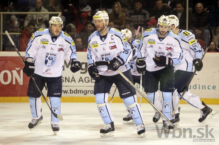 Jozef Stümpel (v strede) a hráči HK Nitra po strelení druhého gólu počas šiesteho semifinálového zápasu play-off slovenskej hokejovej Tipsport extraligy 2014/2015 medzi HC´05 Banská Bystrica - HK Nitra. Banská Bystrica, 27. marec 2015. Foto: SITA/Ján Viazanička