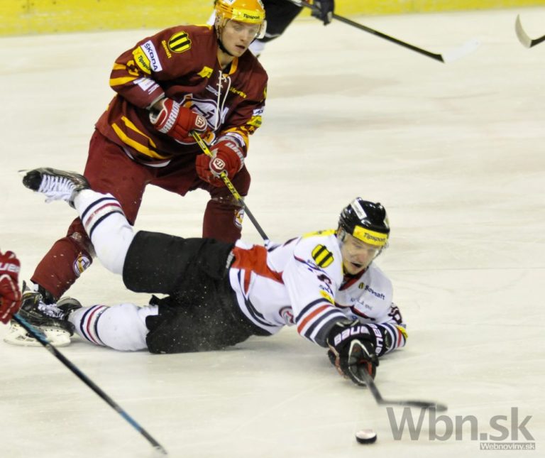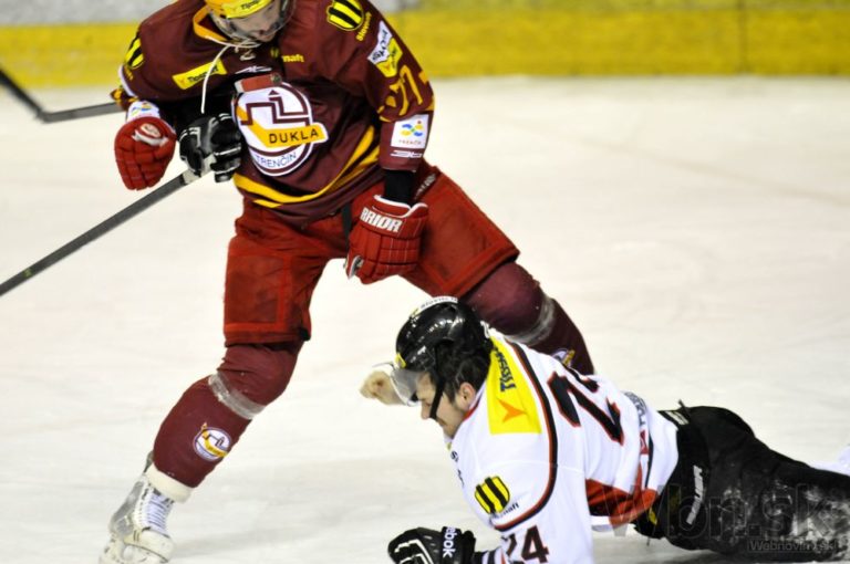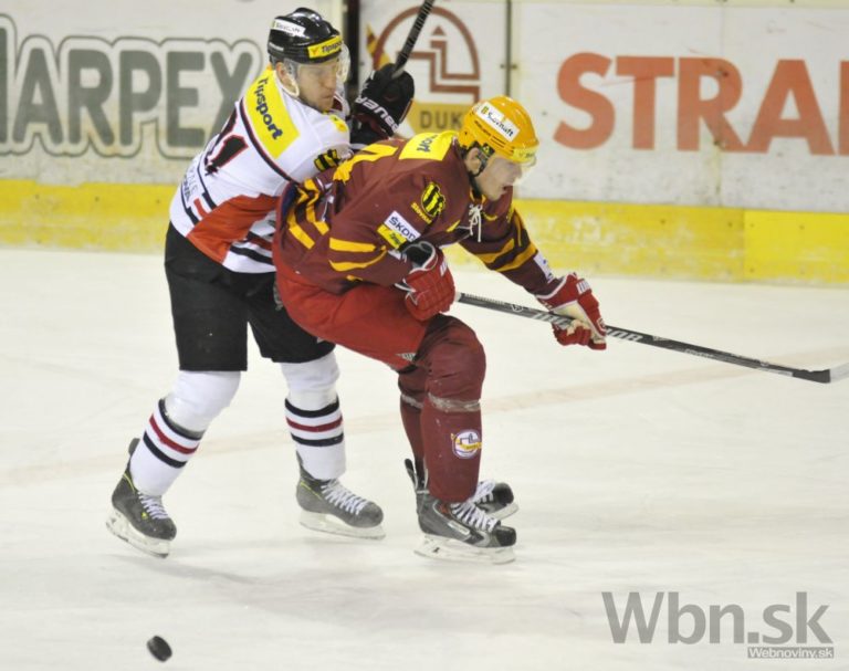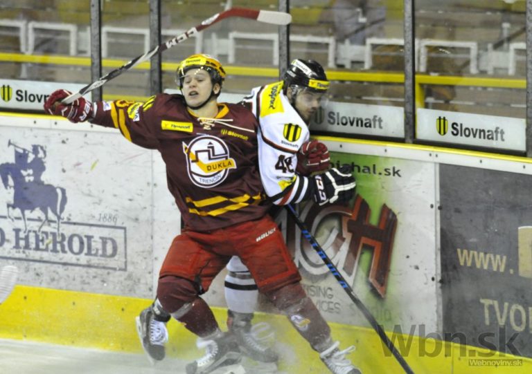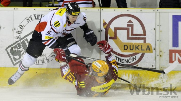 Zľava: Tomáš Bokroš z Dukly Trenčín a Radomír Heizer z HC ´05 Banská Bystrica počas 47. kola hokejovej Tipsport extraligy medzi Dukla Trenčín a HC ´05 Banská Bystrica. Trenčín, 1. február 2015. Foto: SITA/Tomáš Somr