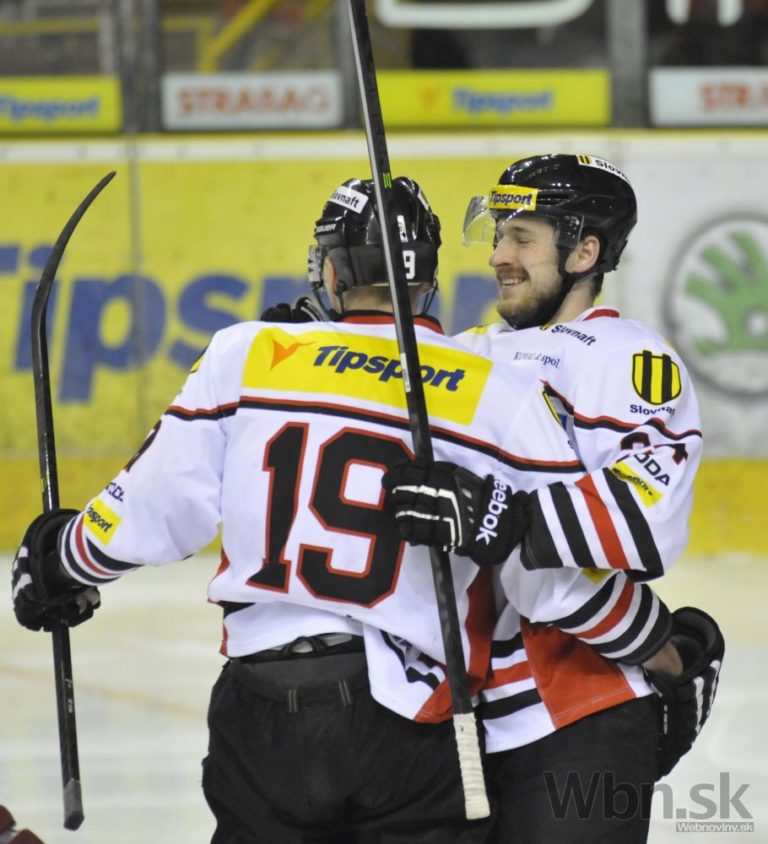 Zľava: Milan Kytnár a Radomír Heizer z HC ´05 Banská Bystrica sa radujú z gólu počas 47. kola hokejovej Tipsport extraligy medzi Dukla Trenčín a HC ´05 Banská Bystrica. Trenčín, 1. február 2015. Foto: SITA/Tomáš Somr