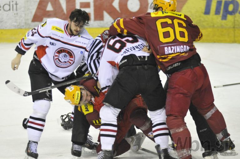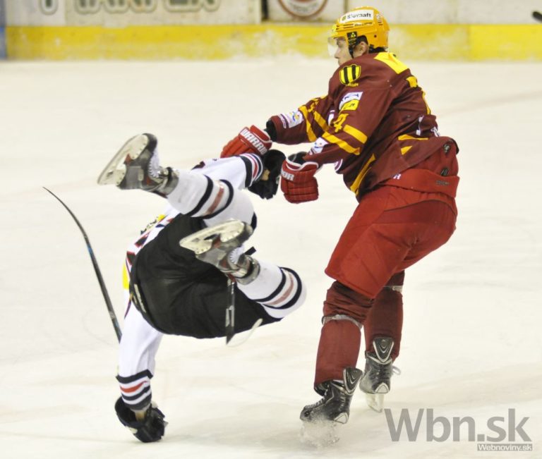Sprava: Marco Hochel z Dukly Trenčín a Tomáš Matoušek z HC ´05 Banská Bystrica v pästnom súboji počas 47. kola hokejovej Tipsport extraligy medzi Dukla Trenčín a HC ´05 Banská Bystrica. Trenčín, 1. február 2015.sport extraligy medzi Dukla Trenčín a HC ´05 Banská Bystrica. Trenčín, 1. február 2015. Foto: SITA/Tomáš Somr