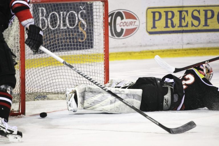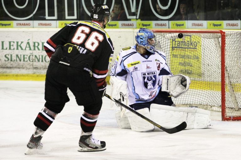 Zane Kalemba (vpravo) z HC'05 Banská Bystrica počas 3. zápasu semifinále slovenskej hokejovej Tipsport extraligy 2013/2014 medzi HC'05 Banská Bystrica - HK Nitra. Banská Bystrica, 30. marec 2014. Foto: SITA/Ján Viazanička