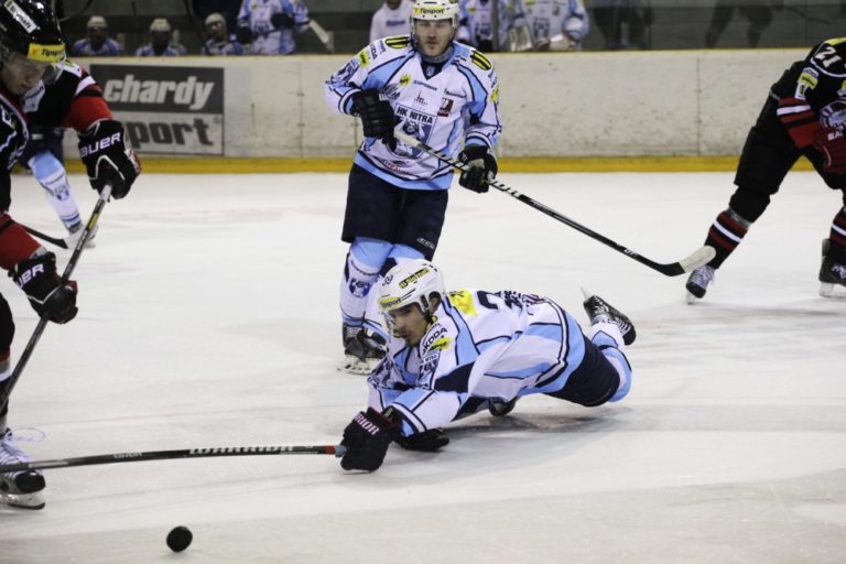 Edmund Piačka (uprostred dole) z HK Nitra počas 3. zápasu semifinále slovenskej hokejovej Tipsport extraligy 2013/2014 medzi HC'05 Banská Bystrica - HK Nitra. Banská Bystrica, 30. marec 2014. Foto: SITA/Ján Viazanička
