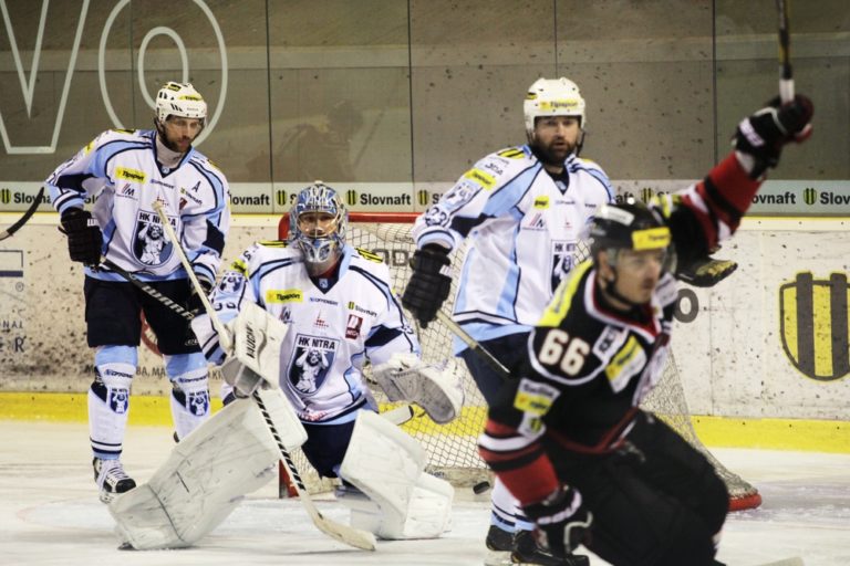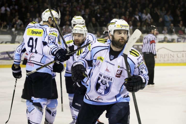 Radosť hráčov HK Nitra zo streleného gólu, na snímke Richard Lelkeš (vľavo) počas 3. zápasu semifinále slovenskej hokejovej Tipsport extraligy 2013/2014 medzi HC'05 Banská Bystrica - HK Nitra. Banská Bystrica, 30. marec 2014. Foto: SITA/Ján Viazanička