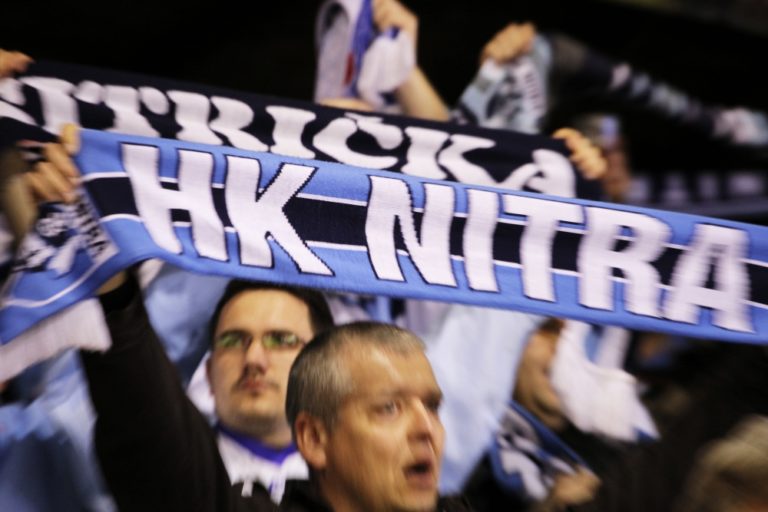 Fanúšikovia HK Nitra počas 3. zápasu semifinále slovenskej hokejovej Tipsport extraligy 2013/2014 medzi HC'05 Banská Bystrica - HK Nitra. Banská Bystrica, 30. marec 2014. Foto: SITA/Ján Viazanička