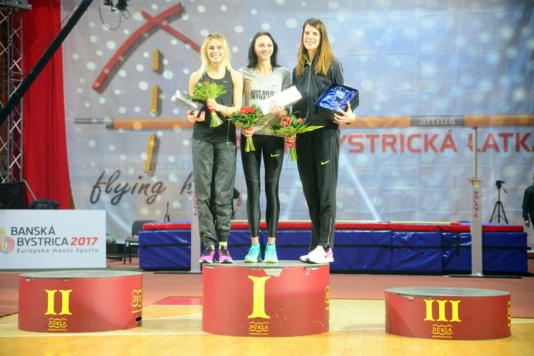 Zľava: Yulia Levchenko z Ukrajiny, druhá v celkovom poradí, Iryna Heraschenko z Ukrajiny, prvá v celkovom poradí, a Ruth Beitia zo Španielska, tretia v celkovom poradí, počas 23. ročníka halového výškarského mítingu Banskobystrická latka 2017. Banská Bystrica, 8. február 2017. Foto: SITA/Jakub Julény