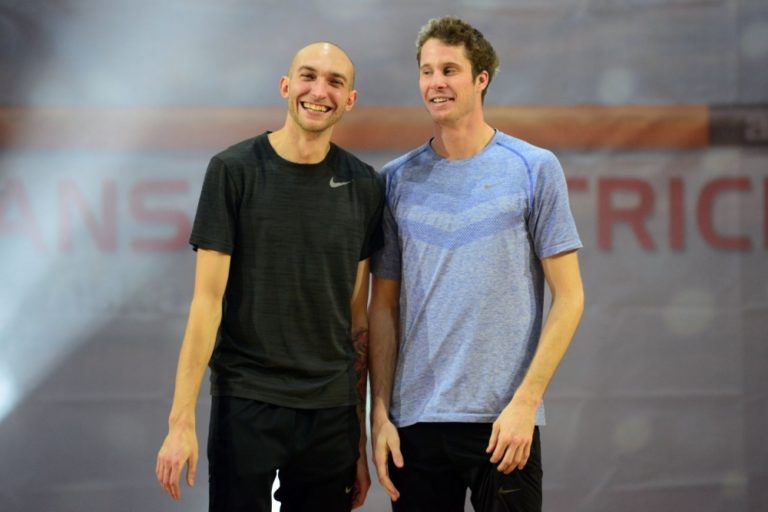 Zľava: Na spoločnom prvom a druhom mieste v celkovom poradí Sylwester Bednarek z Poľska a Derek Drouin z Kanady po ukončení 23. ročníka halového výškarského mítingu Banskobystrická latka 2017. Banská Bystrica, 8. február 2017. Foto: SITA/Jakub Julény