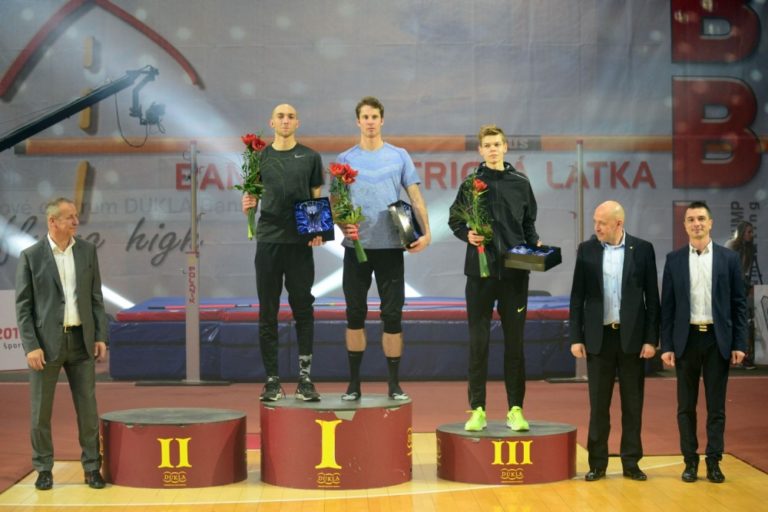Zľava: Na spoločnom prvom a druhom mieste v celkovom poradí Sylwester Bednarek z Poľska a Derek Drouin z Kanady a tretí v celkovom poradí Pavel Seliverstau z Bieloruska spolu s organizátormi počas 23. ročníka halového výškarského mítingu Banskobystrická latka 2017. Banská Bystrica, 8. február 2017. Foto: SITA/Jakub Julény