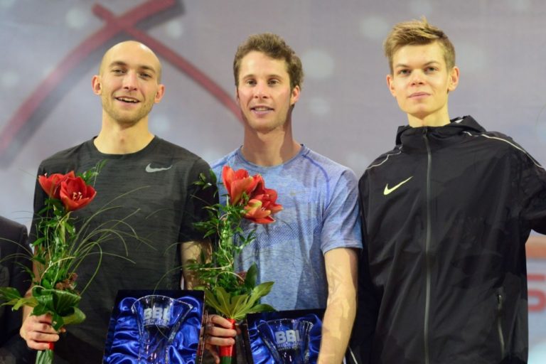 Zľava: Na spoločnom prvom a druhom mieste v celkovom poradí Sylwester Bednarek z Poľska, Derek Drouin z Kanady a tretí v celkovom poradí Pavel Seliverstau z Bieloruska počas 23. ročníka halového výškarského mítingu Banskobystrická latka 2017. Banská Bystrica, 8. február 2017. Foto: SITA/Jakub Julény