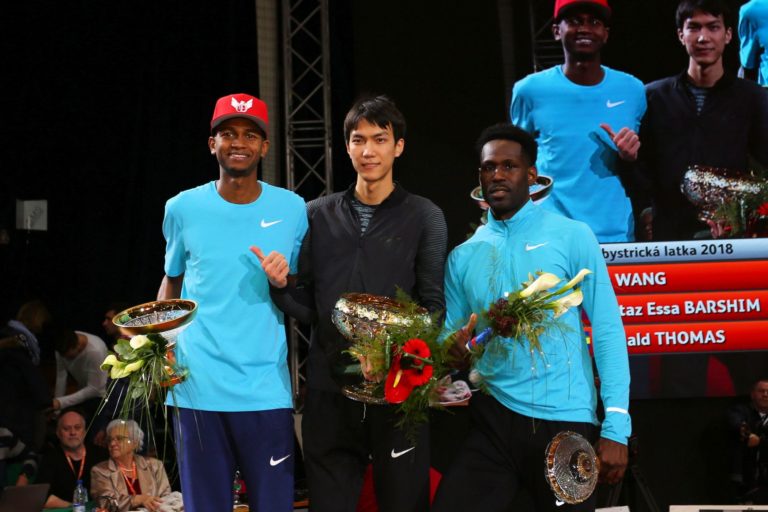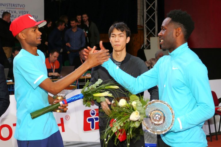 Víťazi zľava: Druhé miesto obsadil katarský výškar Mutaz Essa Barshim, prvé miesto obsadil čínsky výškar Yu Wang a a na treťom mieste bahamský výškar Donald Thomas 24. ročníka halového mítingu v skoku do výšky Banskobystrická latka (BBL) 2018 Banská Bystrica, 6. február 2018. Foto: SITA/Peter Rusko.