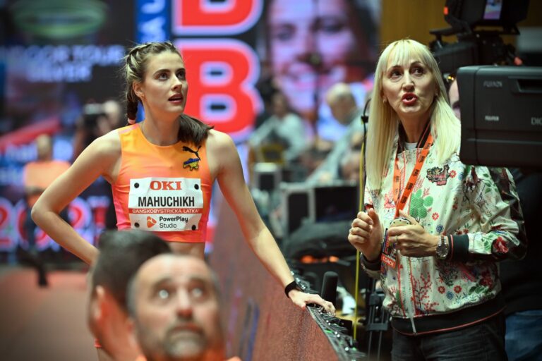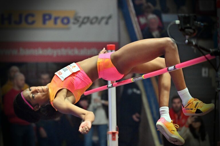 Prvá v celkovom poradí Jaroslava Mahučichová (vľavo) z Ukrajiny počas 31. ročníka halového výškarskeho mítingu Banskobystrická latka 2025. Banská Bystrica, 18. február 2025. Foto: SITA/Jakub Julény