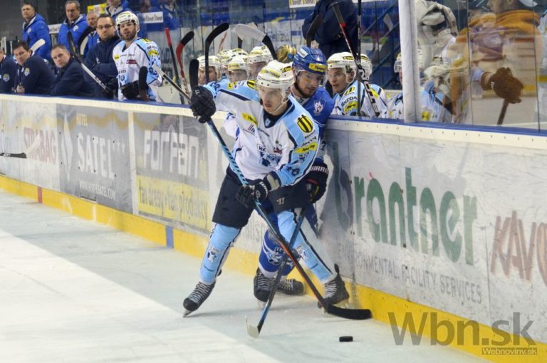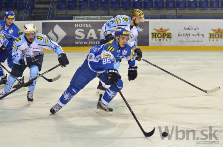 Matúš Matis z HK Poprad (vľavo) počas zápasu 37. kola Tipsport extraligy medzi HK Poprad – HK Nitra. Poprad, 4. január 2015. Foto: SITA/Radoslav Maťaš