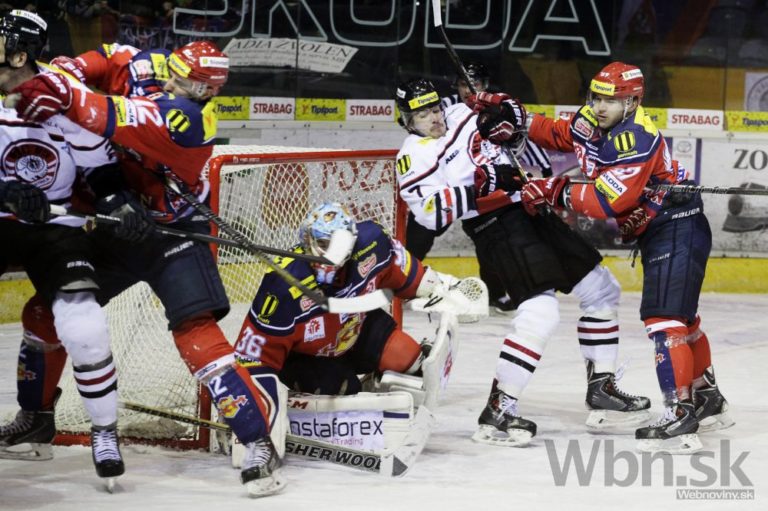 Radosť hráčov HC'05 Banská Bystrica po strelení úvodného gólu počas zápasu 37. kola Tipsport extraligy medzi HKM Zvolen - HC'05 Banská Bystrica. Zvolen, 4. január 2015. Foto: SITA/Ján Viazanička