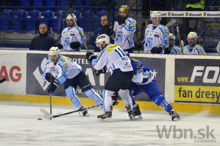 Zľava: Henrich Ručkay a Dušan Milo z HK Nitra počas zápasu 37. kola Tipsport extraligy medzi HK Poprad – HK Nitra. Poprad, 4. január 2015. Foto: SITA/Radoslav Maťaš
