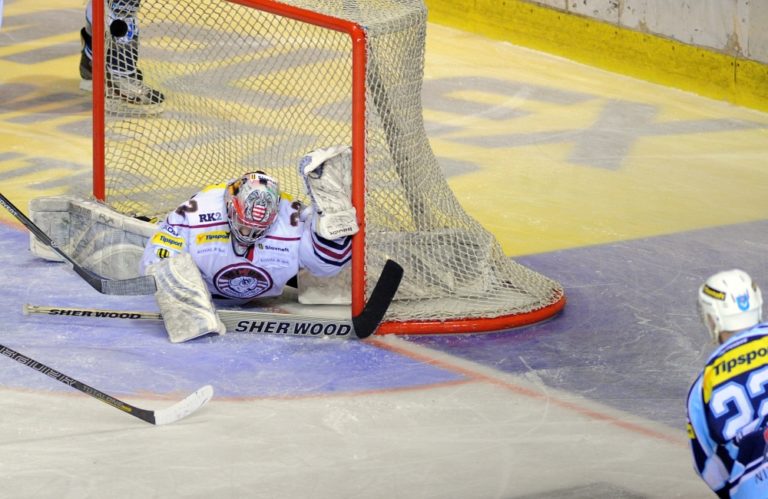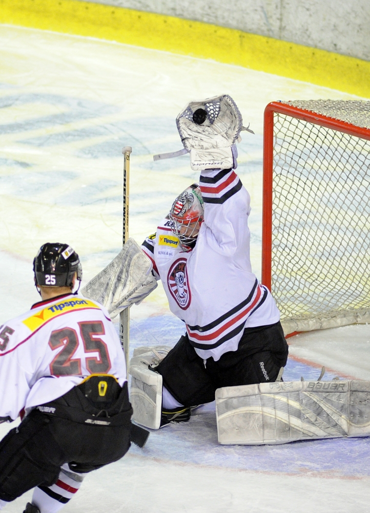 Brankár Zane Kalemba z HC ´05 Banská Bystrica (vpravo) počas 1. zápasu semifinále slovenskej hokejovej Tipsport extraligy 2013/2014 medzi HK Nitra - HC ´05 Banská Bystrica. Nitra, 26. marec 2014. Foto: SITA/Martin Havran