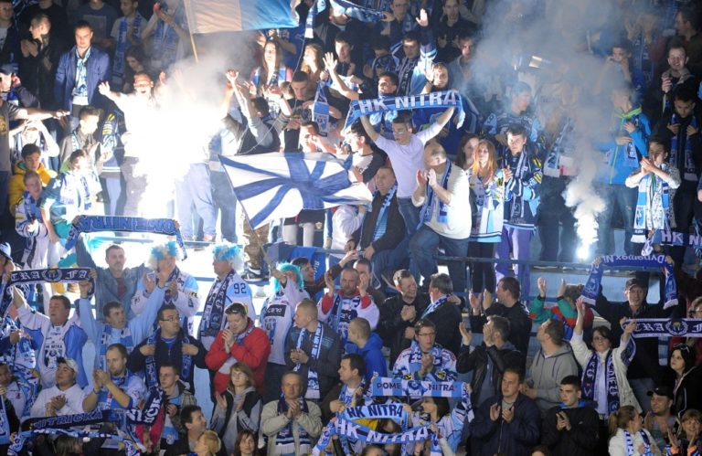 Fanúšikovia HK Nitra po skončení 1. zápasu semifinále slovenskej hokejovej Tipsport extraligy 2013/2014 medzi HK Nitra - HC ´05 Banská Bystrica. Nitra, 26. marec 2014. Foto: SITA/Martin Havran