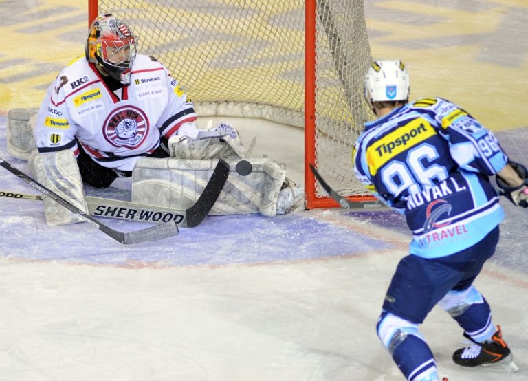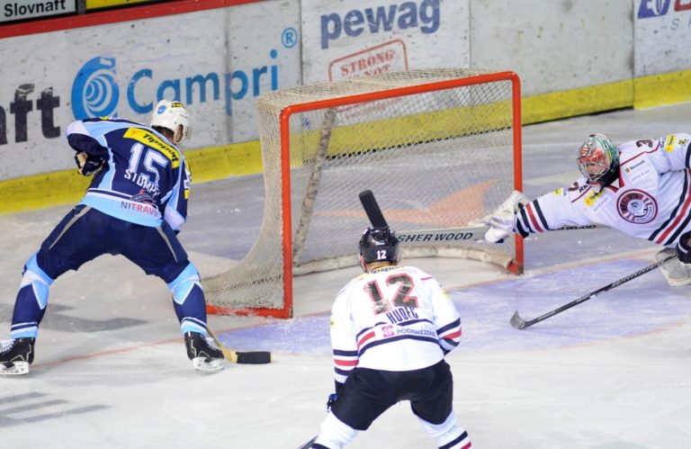 Lukáš Novák z HK Nitra (vpravo) a brankár Zane Kalemba z HC ´05 Banská Bystrica (vľavo) počas 1. zápasu semifinále slovenskej hokejovej Tipsport extraligy 2013/2014 medzi HK Nitra - HC ´05 Banská Bystrica. Nitra, 26. marec 2014. Foto: SITA/Martin Havran