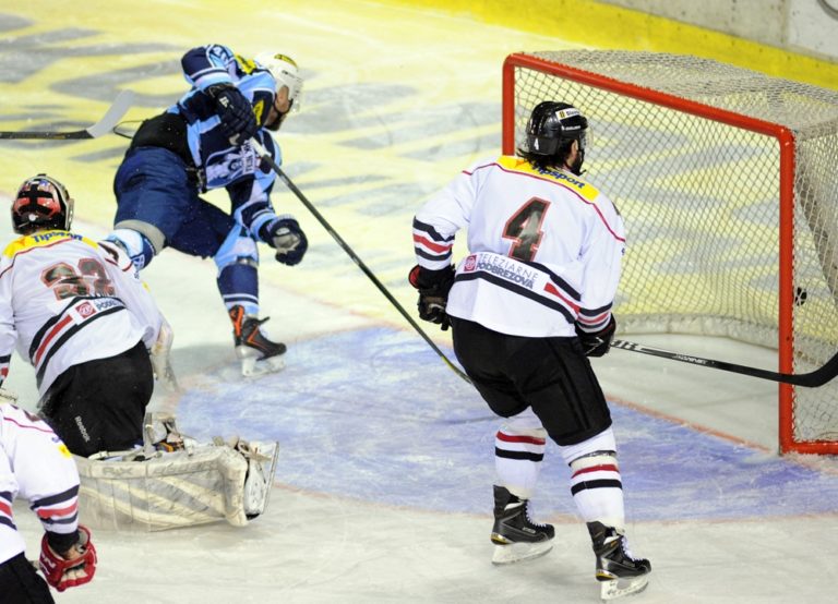 Henrich Ručkay z HK Nitra (vpravo) a brankár Zane Kalemba z HC ´05 Banská Bystrica (vľavo) počas 1. zápasu semifinále slovenskej hokejovej Tipsport extraligy 2013/2014 medzi HK Nitra - HC ´05 Banská Bystrica. Nitra, 26. marec 2014. Foto: SITA/Martin Havran