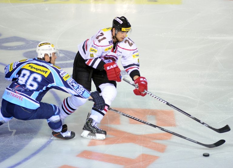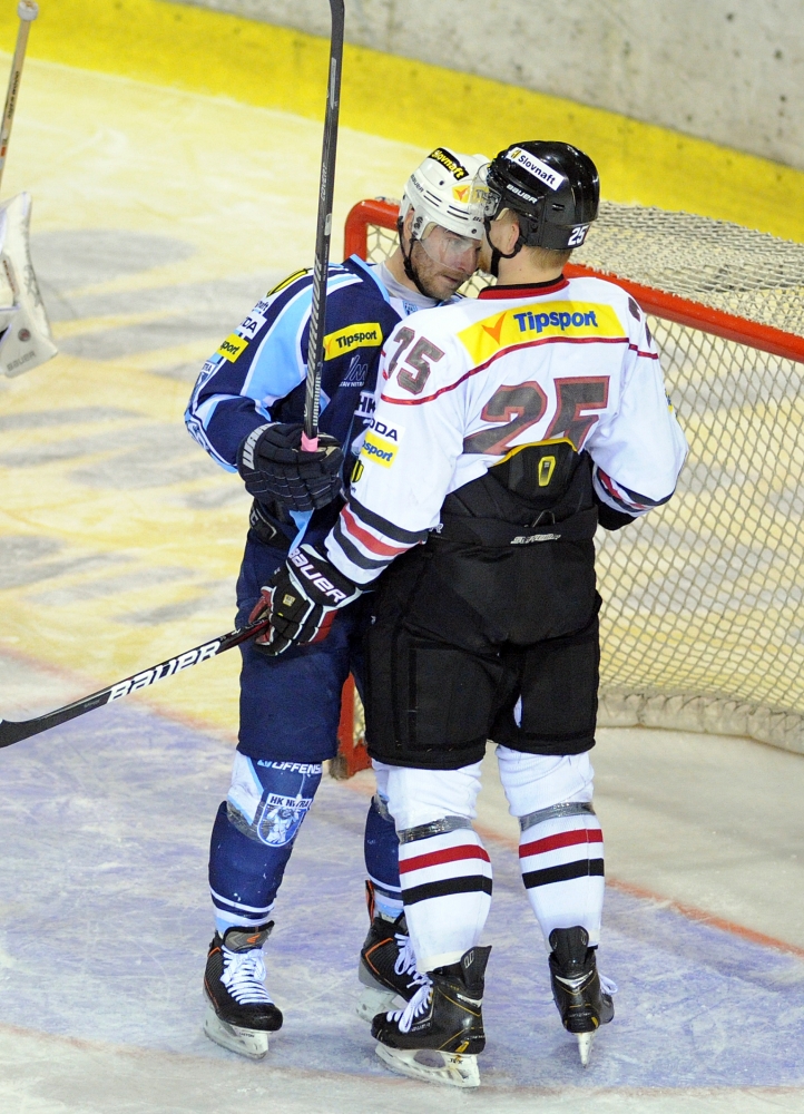 Miroslav Kováčik z HK Nitra (vpravo) a Lukáš Bambúch z HC ´05 Banská Bystrica (vľavo) počas 1. zápasu semifinále slovenskej hokejovej Tipsport extraligy 2013/2014 medzi HK Nitra - HC ´05 Banská Bystrica. Nitra, 26. marec 2014. Foto: SITA/Martin Havran