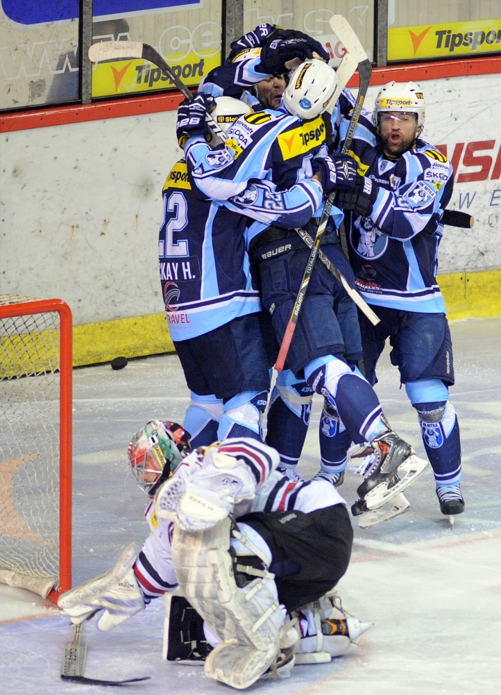 Radosť hráčov HK Nitra z úvodného gólu počas 1. zápasu semifinále slovenskej hokejovej Tipsport extraligy 2013/2014 medzi HK Nitra - HC ´05 Banská Bystrica. Nitra, 26. marec 2014. Foto: SITA/Martin Havran