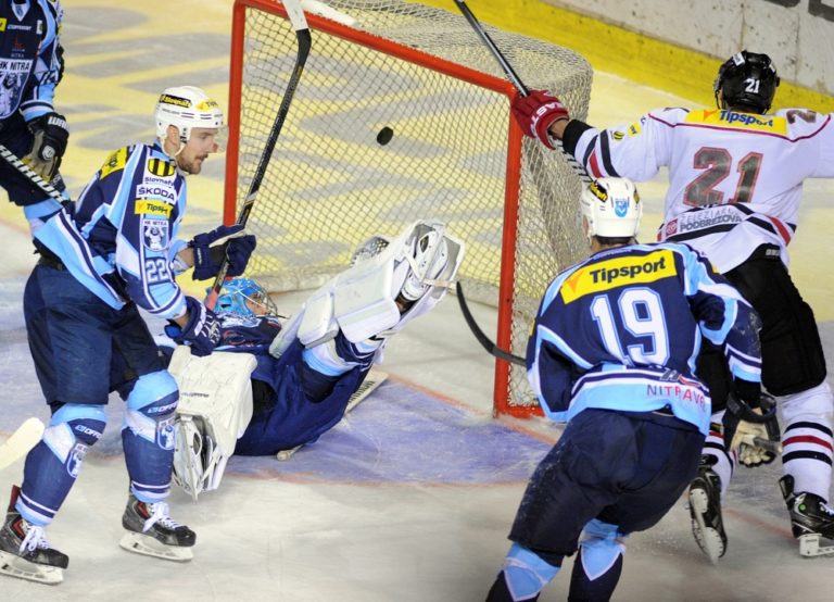 Miroslav Kováčik z HK Nitra (vľavo), brankár Zane Kalemba (v strede) a Jason Lepine (vpravo) z HC ´05 Banská Bystrica počas 1. zápasu semifinále slovenskej hokejovej Tipsport extraligy 2013/2014 medzi HK Nitra - HC ´05 Banská Bystrica. Nitra, 26. marec 2014. Foto: SITA/Martin Havran