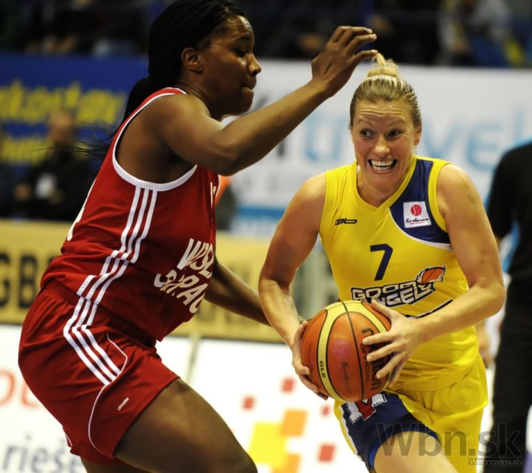 Zľava: Allie Quigley z Krakova a Romy Bär z Košíc v zápase A-skupiny medzi Good Angels Košice - Wisla Can-Pack Krakov (Poľ.) basketbalovej Euroligy žien. Košice, 5. november 2014. Foto: SITA/Tibor Zmak