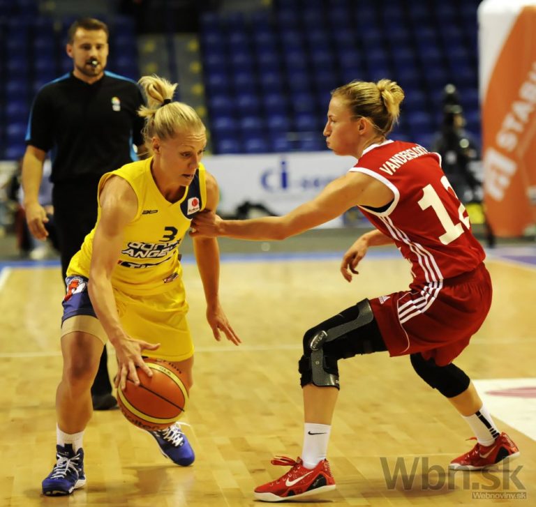 Zľava: Tijana Krivačevič z Košíc a Gintaré Petronyté z Krakova v zápase A-skupiny medzi Good Angels Košice - Wisla Can-Pack Krakov (Poľ.) basketbalovej Euroligy žien. Košice, 5. november 2014. Foto: SITA/Tibor Zmak