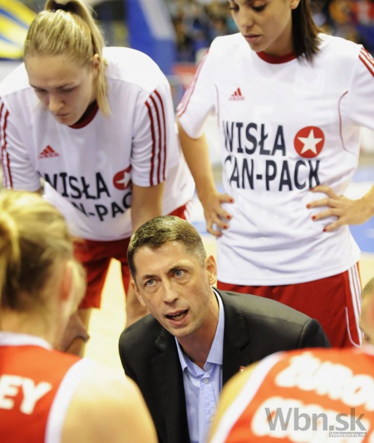 Tréner Krakova Štefan Svitek medzi svojimi hráčkami v zápase A-skupiny medzi Good Angels Košice - Wisla Can-Pack Krakov (Poľ.) basketbalovej Euroligy žien. Košice, 5. november 2014. Foto: SITA/Tibor Zmak