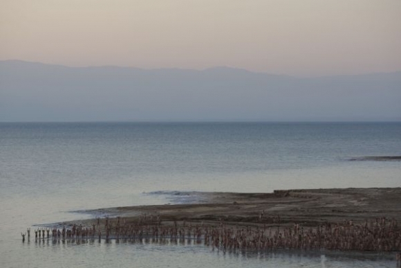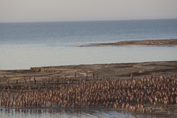 Dobrovoľníci pózujúci na akte Spencera Tunicka zdravia svet z pobrežia Mŕtveho mora 17. septembra 2011. Foto: SITA/AP