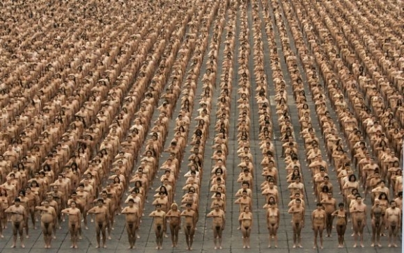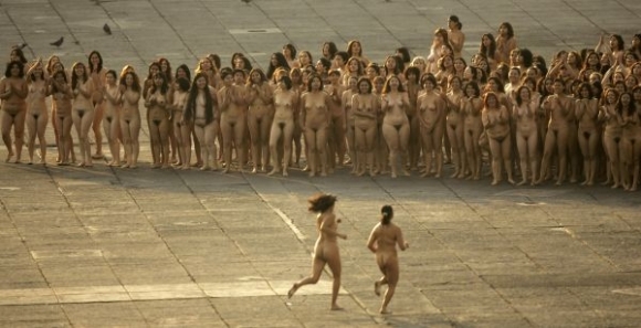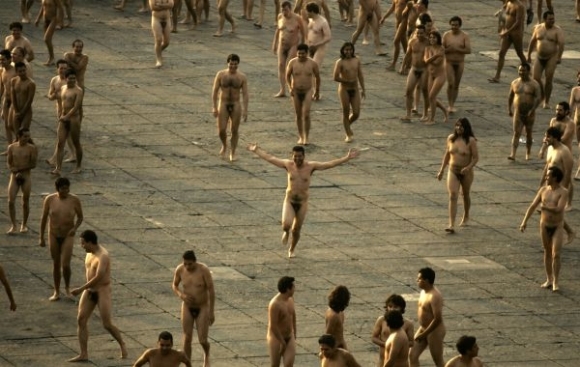 Tisíce nahých ľudí s pravou vztýčenou pažou na znak vlastenectva na hlavnom námestí Zocalo v Mexico City 6. mája 2007. Foto: SITA/AP
