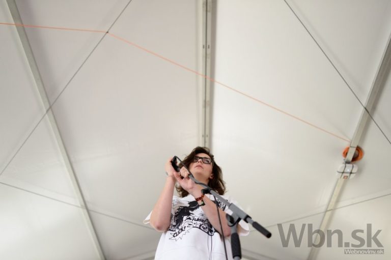 (Účastníčka festivalu po adrenalínovom zoskoku.) Atmosféra počas druhého dňa 19. ročníka multižánrového festivalu Bažant Pohoda 2015. Trenčín, 10. júl 2015. Foto: SITA/Robert Tappert