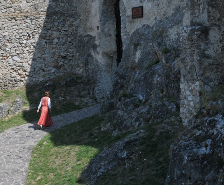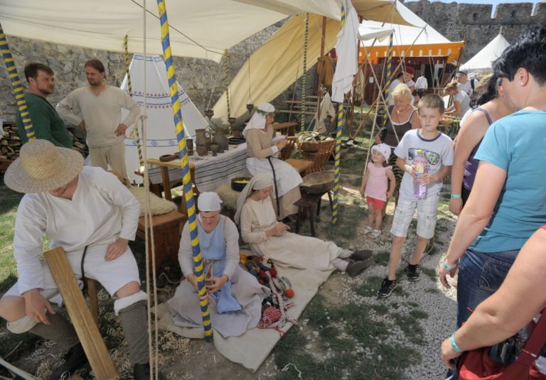 Návštevníci si prezerajú ukážku stredovekých remesiel na hrade Beckov počas letnej turistickej sezóny 2014. Beckov, 20. júl 2014. Foto: SITA/Martin Medňanský